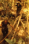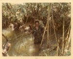 We're on a light patrol in Song Be, must have left our packs and gear back at the NDP. It's hot, we're thirsty and sweated up, so the stream crossing (is that a VC bridge or just fallen bamboo), the stream crossing looks good. The water is cool and clear and hits the spot even though our wet feet will turn white and wrinkle up until our boots and socks are dry. That's Lloyd Edge, aka 'Butch' in the lead, red haired Steve York behind him humping the gun on the base of his neck. Gary Williams, from the great state of Tennessee poses mid-stream while I take his picture; I've already made it to the other side. When everyone has crossed I put the camera away and ask someone to pour water on my head. So someone does that and it feels good, real good. The water sluicing over my hair, the water sluicing down my sweat soaked fatigues, the water pouring into my aid bag, no matter, the bandages are already wet. Clipped to my pistol belt, next to the forty-five, a few grenades. Never know when you might need one. In fact, point man Larry Roy once yelled, "Doc, throw me a grenade," when the bad guys surprised us good. So I tossed him one and he lobbed it just right and after the muffled BOOM we thought everything would be OK. But then we heard a Chicom's fuse snap and moments later the tumbling stick fell short and blew up the gun, the barrel torn and twisted, kicked up dust and leaves filtering down. It got real quiet. Then the second Chicom, the second one landed among us and everyone scuttled away. BOOM. The blast lifting us up, throwing us down, Wilson getting it worst. Later, the medivac crew ran out of stretchers so we loaded him onto the bird with my hammock. Thirty years later we met up in Michigan. He said the chopper flew to Quan Loi but that incoming started as they touched down. He said guys off loading the wounded dropped the litters and ran. So Wilson and the other WIA's are lying on the strip until the shelling stops. It was crazy. He says after the attack the LT runs out to the tarmac and gives him a paper plate full of greasy fried chicken and a can of Coke. Wilson so hungry he eats the food, drinks the Coke, then stands up. Unbuttons his bloodied pants. He can see his combat boots through the dime sized hole in his pecker. "But they did a good job sewing me up," he says, "Everything works just fine." |