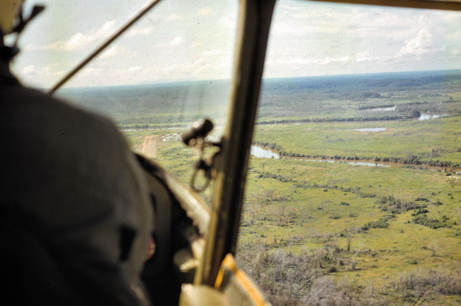 Xom Cat Landing Strip is over the pilot's right shoulder This camp is made of Cambodian troops and their families - It is on the