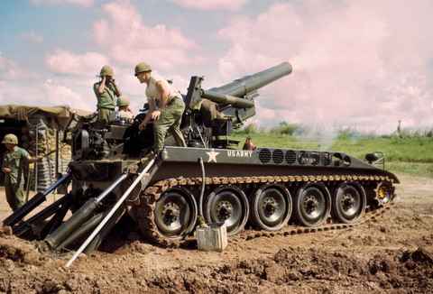 Fire mission 8 inch howitzer fires at low angle - note the spade on the rear that holds the platform stable as the weapon is fired Adin Tooker Photo