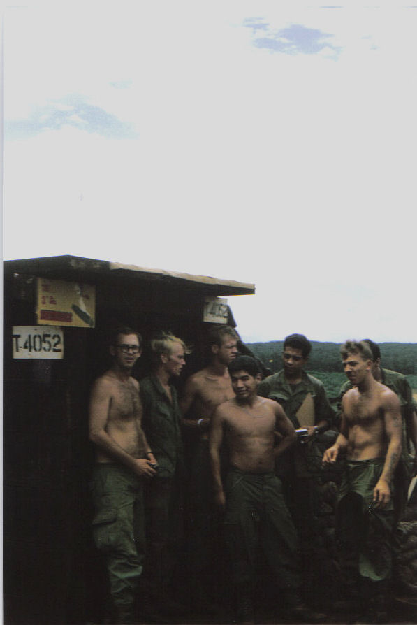 Entrance to #2 Bunker (Front left) Loomis, Clarke, Dobbins, Hernandez (in front), Alvarez and Lawler - Quan Loi - 1969 CClarke Photo