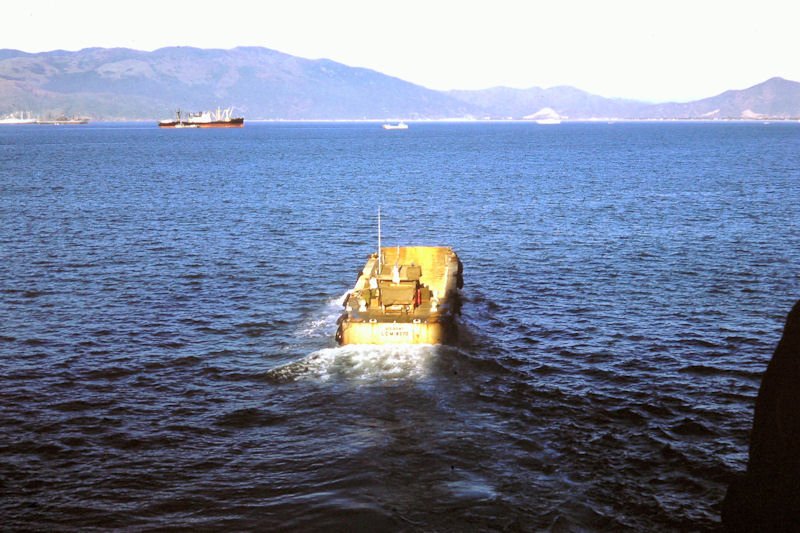 Landing barge going back to shore with brass