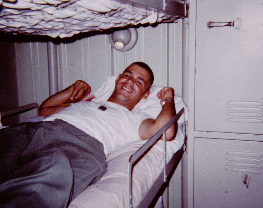 20 White Beach Officers Club: Gary Garman (Clockwise - Front L), Cecil Gardner, Jim Coggins , Jim Thomson, John Girardeau, Bob Blickenstaff, Bob Shaw, Don Withrow, "Stoney" Gravelle. Note: Cecil Gardner was the Officer of the Day. He returned to the ship later when the fire in the brig occurred.