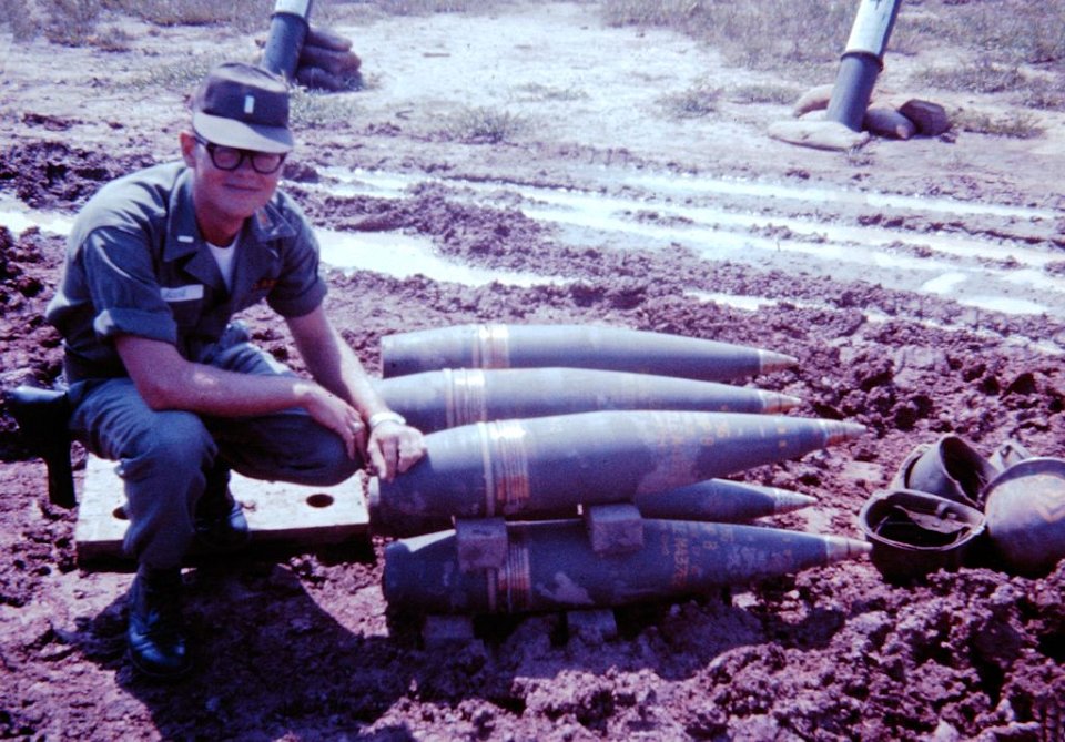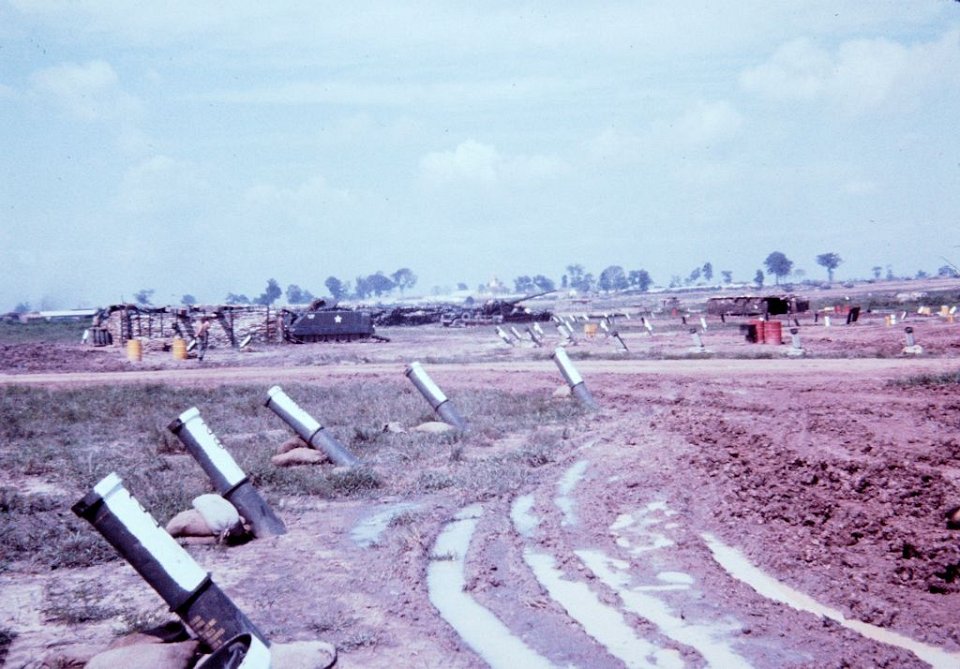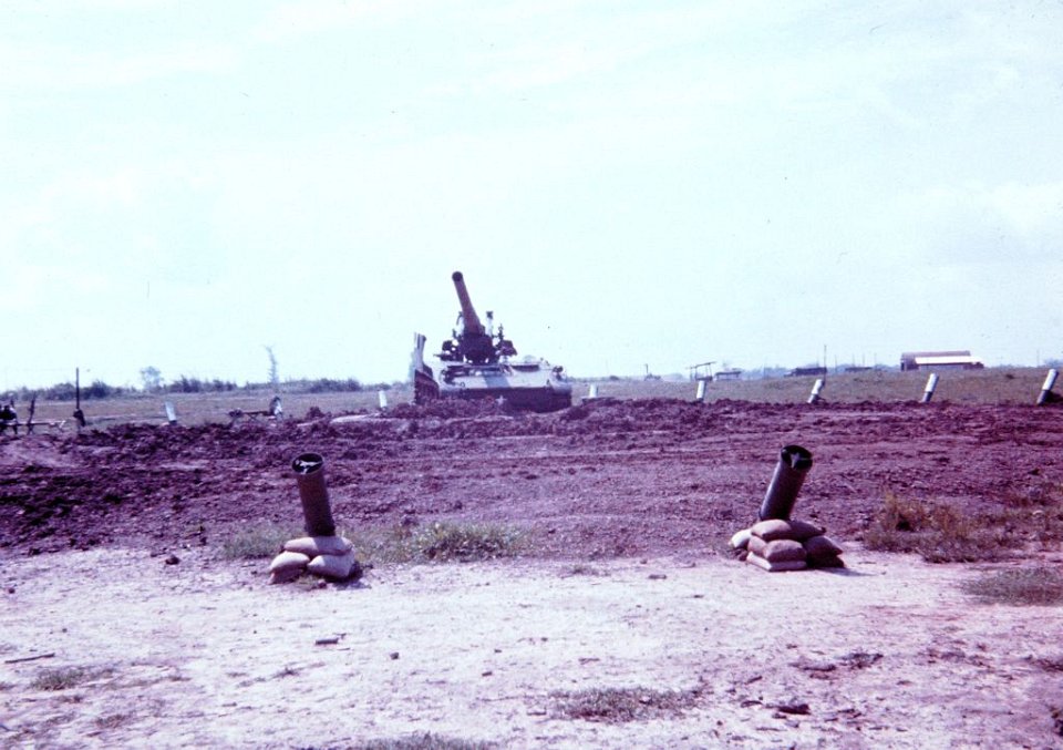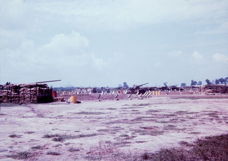 42 The powder canisters sticking out of the ground in a circle around the gun were reference aiming points that were used to help relay the gun when it had to “swing trails” to another azimuth of fire.