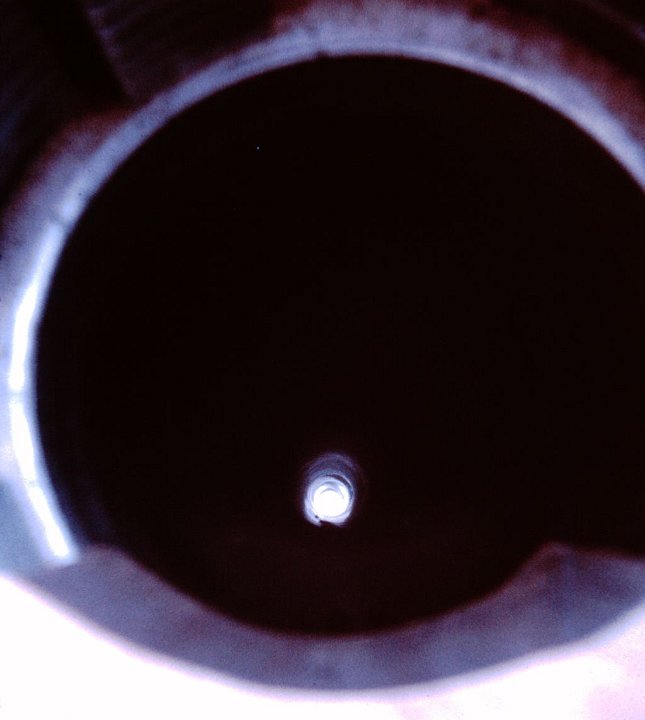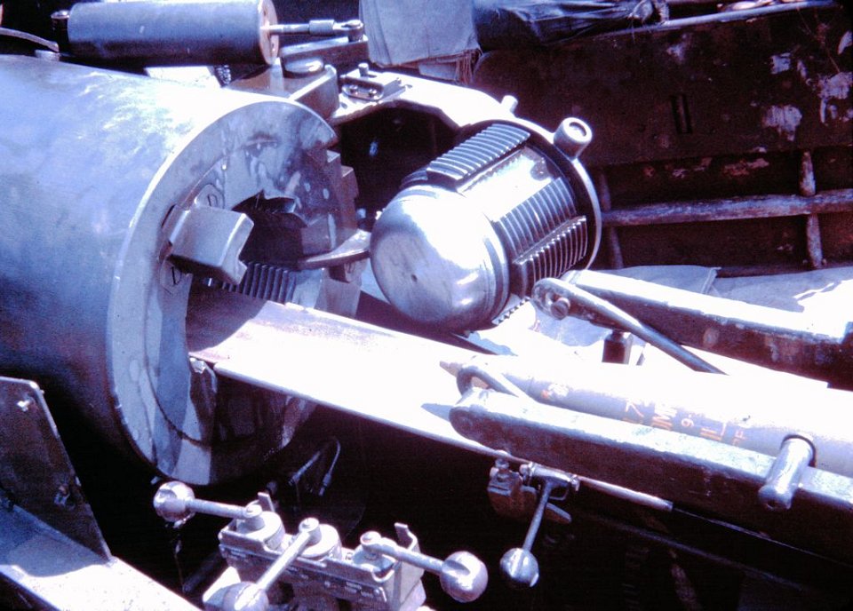 53 175 gun breech. Typical of artillery designed for separate loading ammunition (separate projectile, propellant charge, and primer: no shell casing) it has a step-threaded interrupted screw type of breech block with a mushroom head obturator.