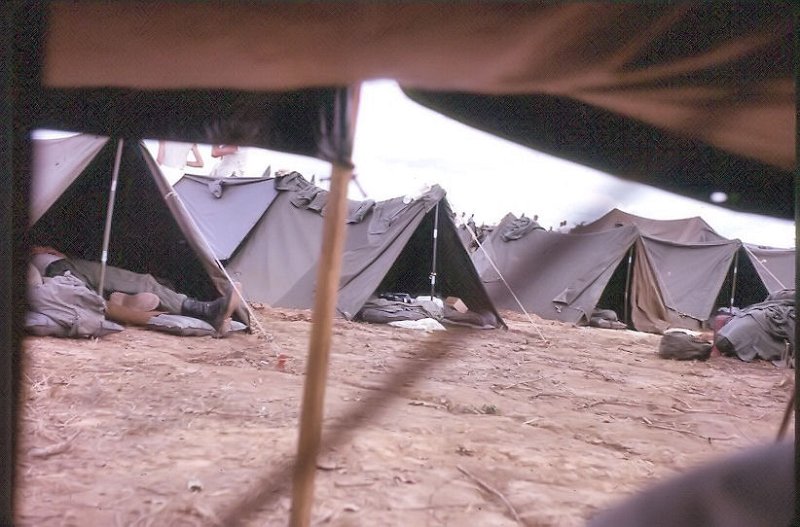 "Tents at staging area on the grounds of Saigon University. - We woke up the next morning in 2" of water. THAT WAS FUN!! (See Note #1 Below) "