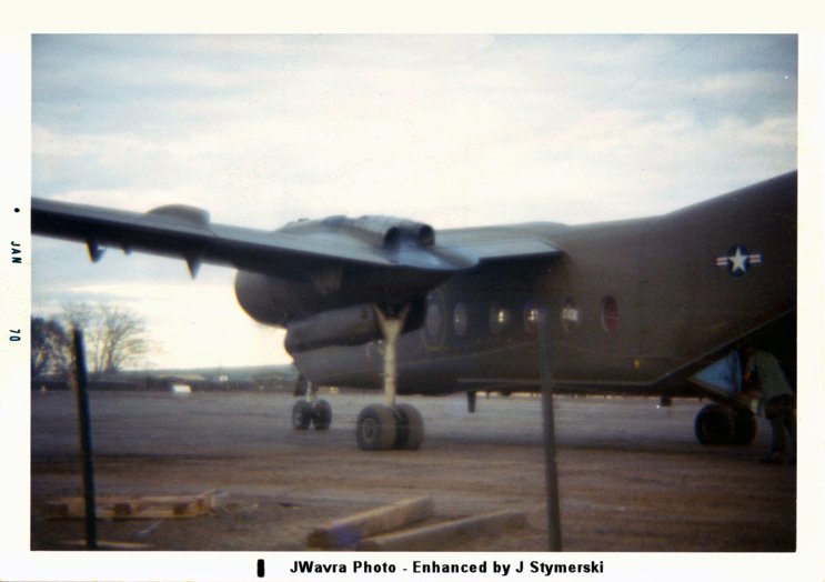 | I had been a passenger in this Caribou in December 1969 when I was lucky to have been chosen to fly to Chu Chi to see Bob Hope's Christmas show there. I snapped this photo after landing in Quan Loi at 8th Aerial Port on the south side of the airstrip. Naturally, I rescanned the photo, which was not of the best quality to begin with, and emailed it to John Stymerski. Shortly I received this follow-up email from John: |
