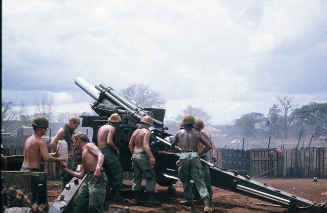 "Loading a Jo and getting powder charge ready for a fire mission at Quan Loi."